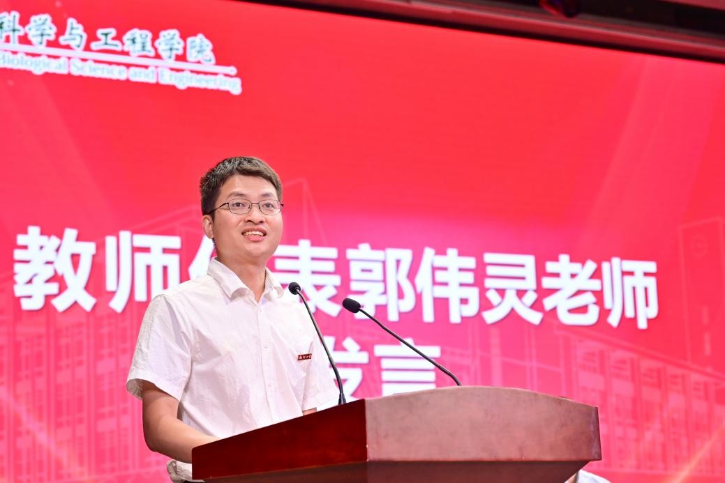 教师代表郭伟灵以“自信、主动、踏实、快乐”四个关键词为核心寄语新生。他鼓励生工学子以自信为帆,主动为桨,踏实为锚,快乐为灯塔。在知识的海洋中乘风破浪,在人生的旅途中勇敢探索、尽情创造。主动将专业所学与时代需求紧密结合,勇做敢闯敢试的青年先锋,让“福大精神”在生工学子中薪火相传。