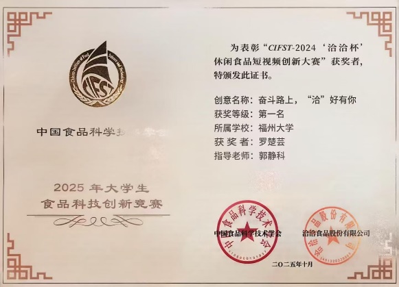 张雯教授、郭静科副教授指导的罗楚芸同学在“CIFST-2024‘洽洽杯’休闲食品短视频创新大赛”中脱颖而出,荣获第一名。罗楚芸同学凭借独特的创意和扎实的专业知识折桂,充分展现了女同无码