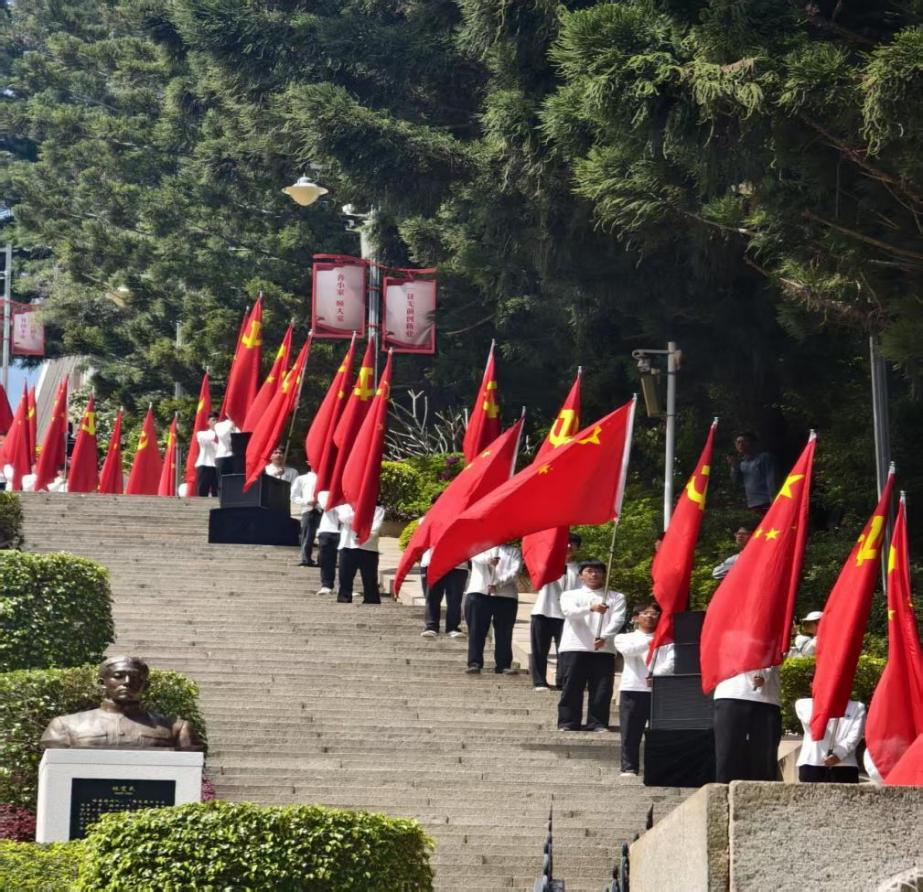 清晨的革命英烈纪念园,松柏肃立。志愿者们身着统一服装、肩披绶带,跟随队伍拾级而上,迈向先辈长眠之地。层层石阶镌刻历史回响,铿锵步履饱含崇敬之心,每一步前行,都是对英烈的深切追念,心中的红色信仰愈发坚定。